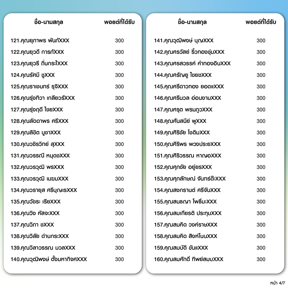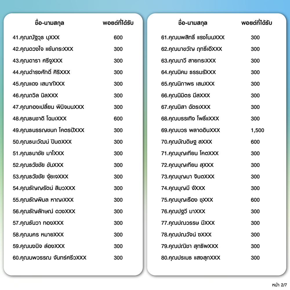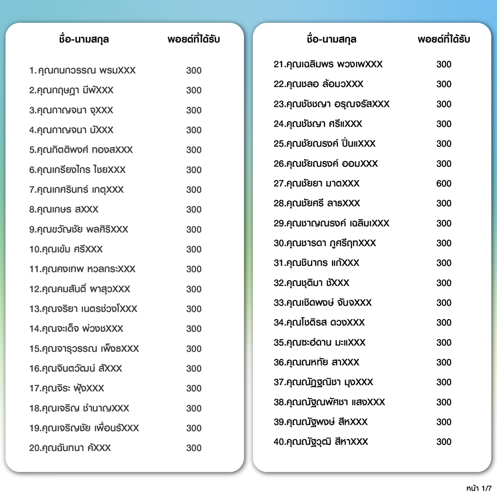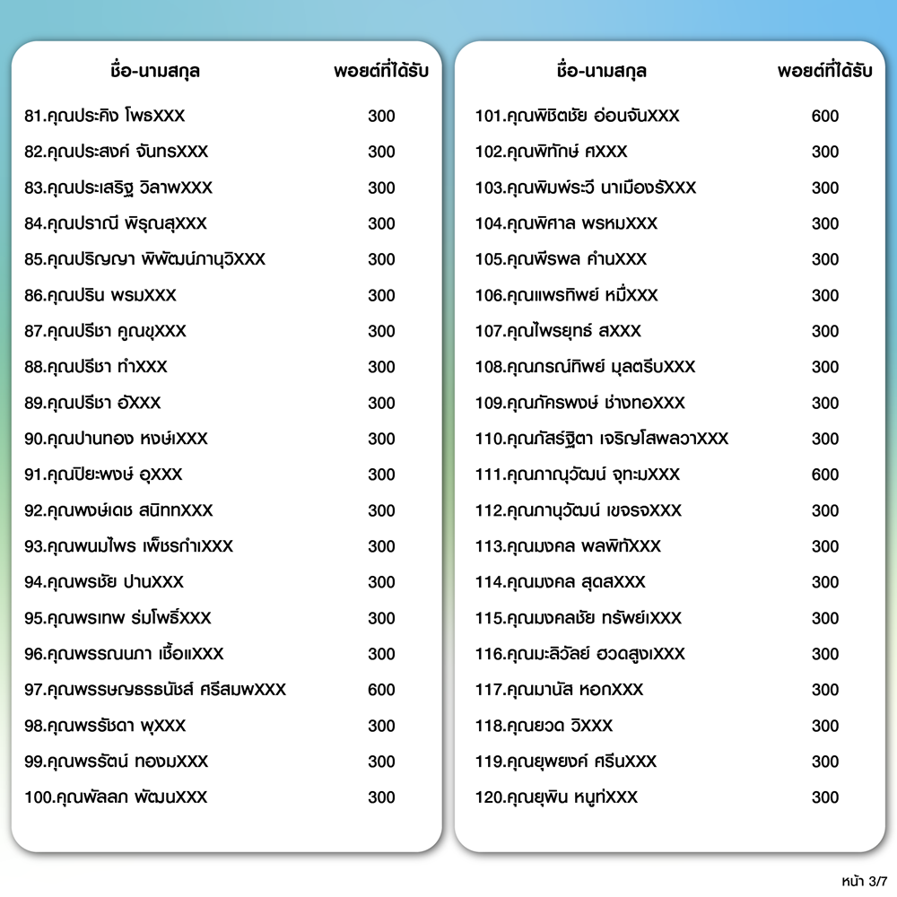 บริษัทฯ จะทำการเพิ่มคะแนนให้ลูกค้าที่เข้าเงื่อนไขตามรายชื่อข้างต้น จำนวน 273 ท่าน ในวันที่ 1 ธ.ค. 68