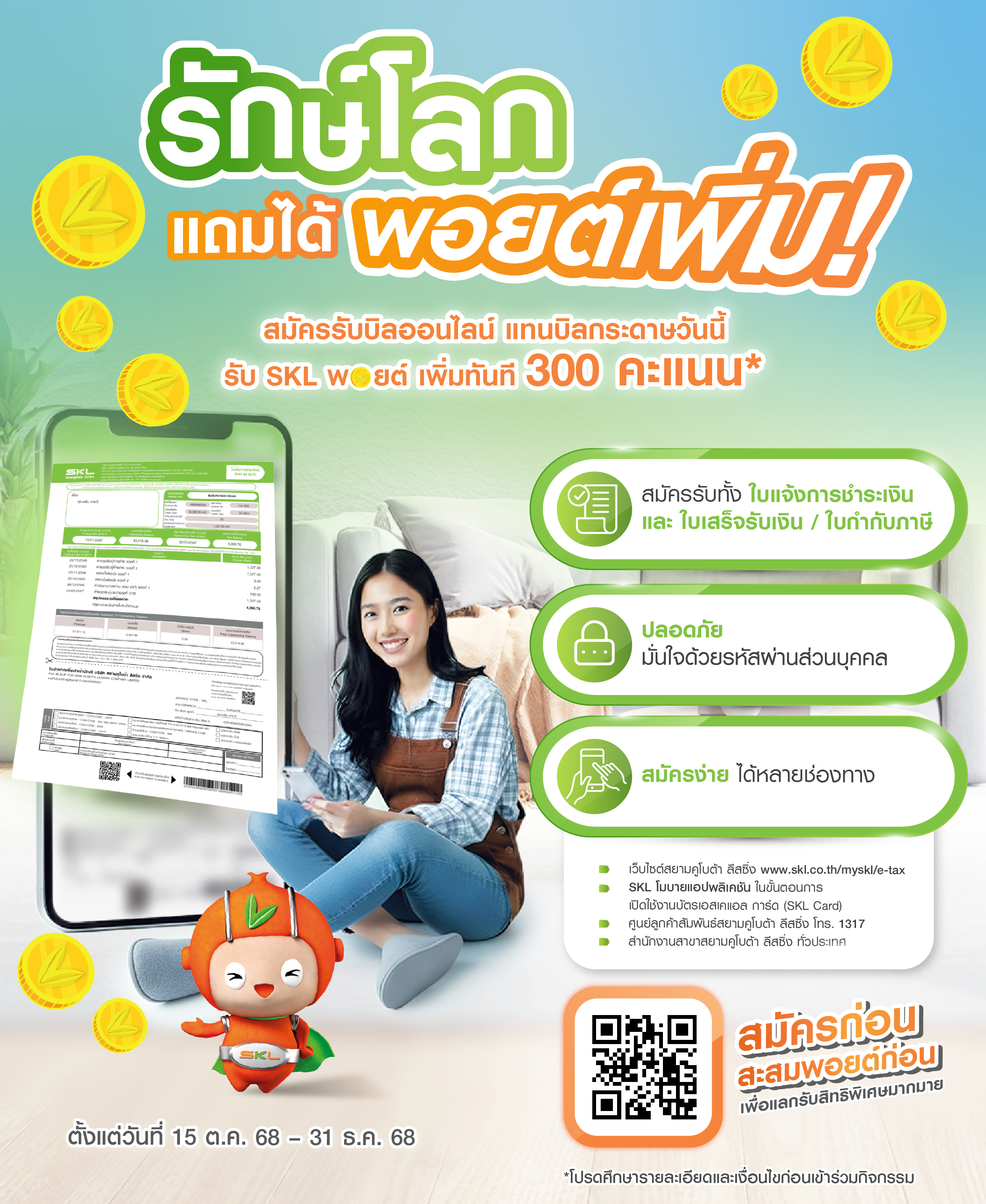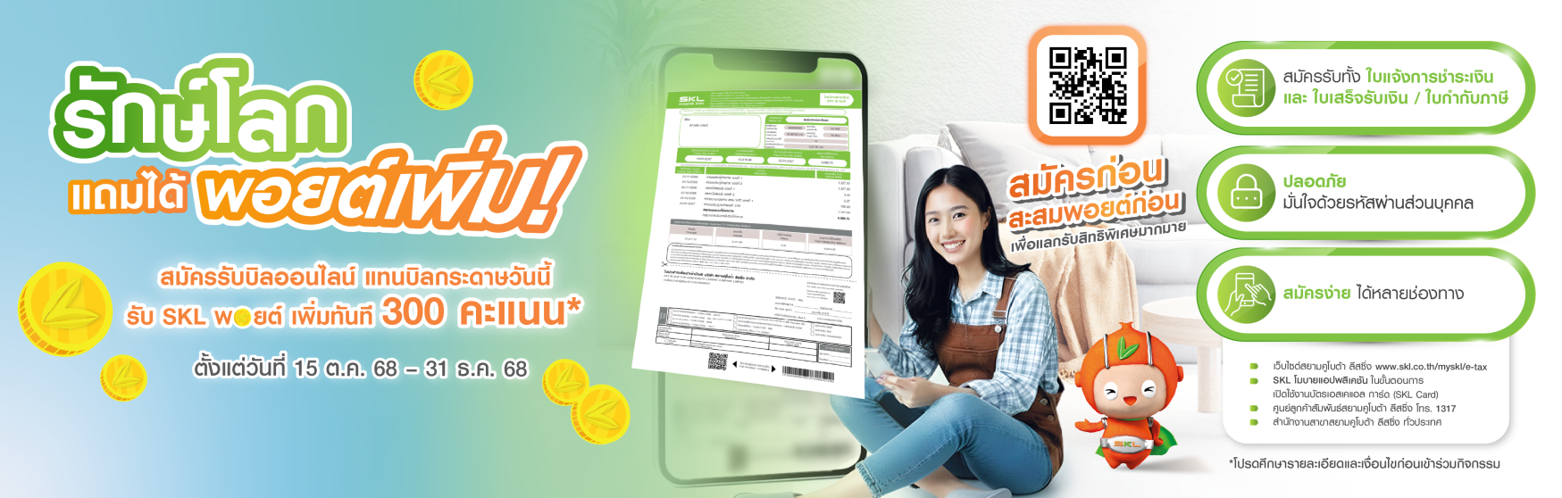 รักษ์โลก แถมได้พอยต์เพิ่ม สมัครรับบิลออนไลน์ แทนบิลกระดาษ รับ SKL พอยต์ เพิ่มทันที 300 คะแนน