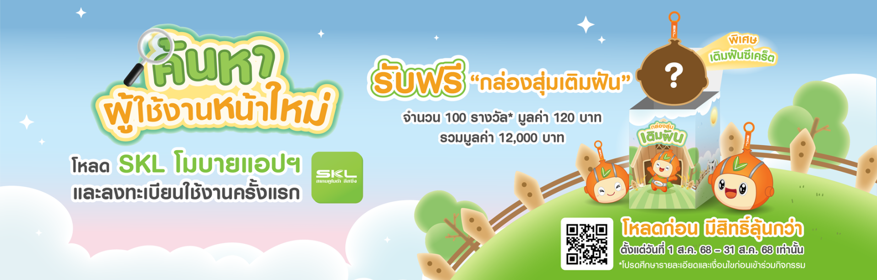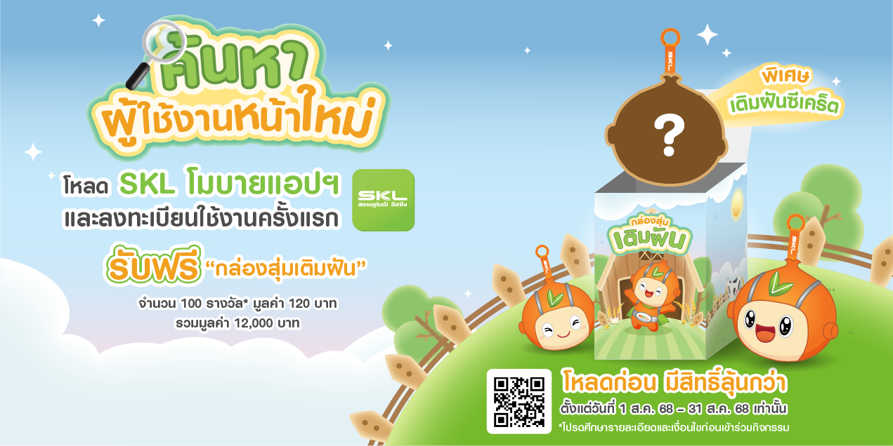 ค้นหา ผู้ใช้งานหน้าใหม่ โหลด SKL โมบายแอปฯ และลงทะเบียน รับฟรี! “กล่องสุ่มเติมฝัน”