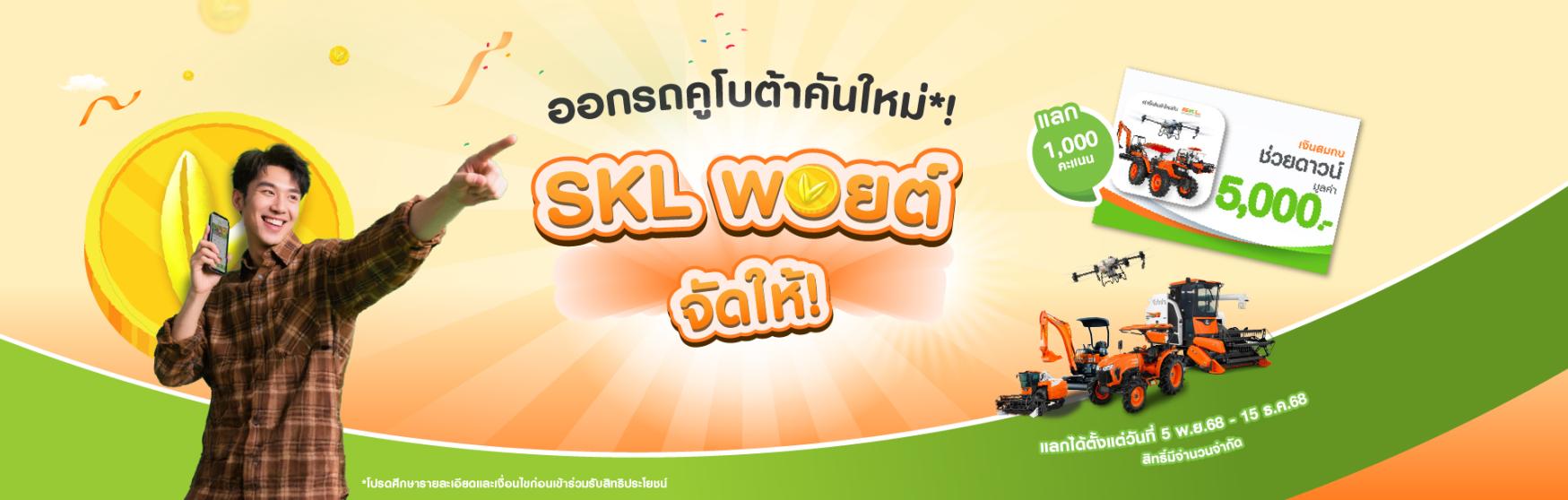 - ใช้คะแนน SKL พอยต์ 1,000 คะแนน แลกรับสิทธิ์ช่วยดาวน์เพิ่ม 5,000 บาท เมื่อเช่าซื้อสินค้าใหม่ที่ร่วมรายการได้แก่ แทรกเตอร์ รถเกี่ยวนวดข้าว รถดำนา รถขุด หรือ โดรนการเกษตร กับ บริษัท สยามคูโบต้า ลีสซิ่ง จำกัด เท่านั้น
