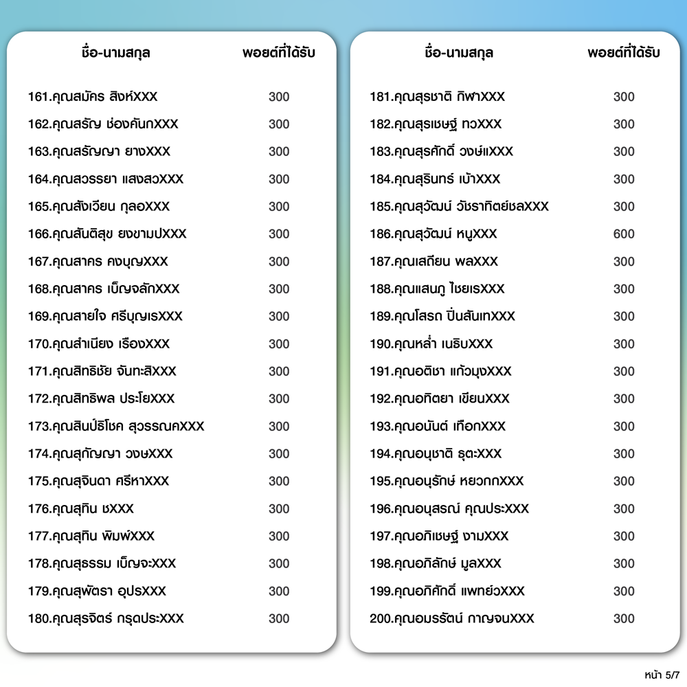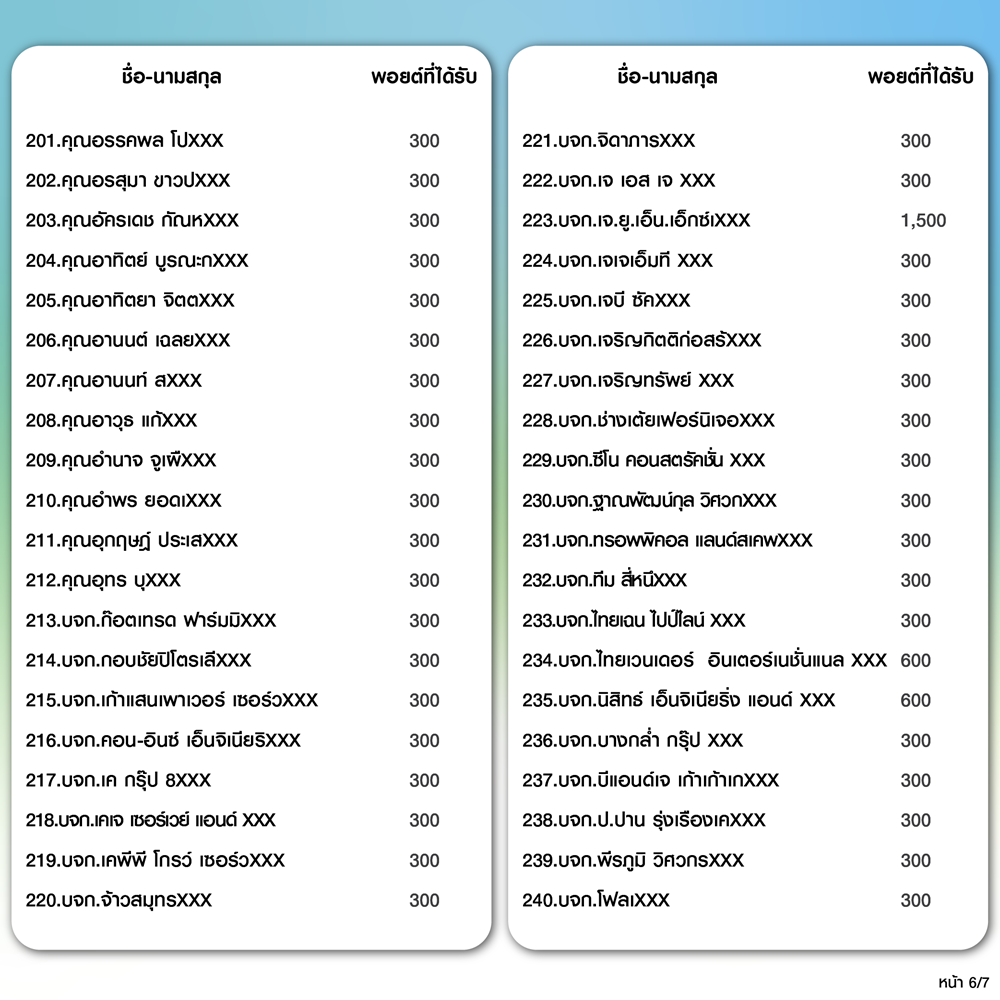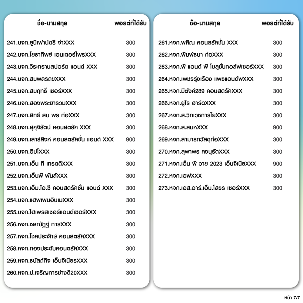 บริษัทฯ จะทำการเพิ่มคะแนนให้ลูกค้าที่เข้าเงื่อนไขตามรายชื่อข้างต้น จำนวน 273 ท่าน ในวันที่ 1 ธ.ค. 68