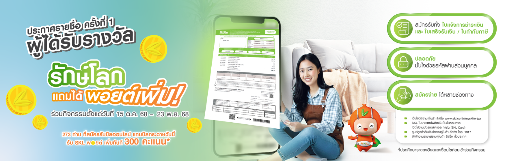 - คะแนน SKL พอยต์ที่ได้รับ เป็นคะแนนรวมตามสัญญาเช่าซื้อที่ท่านได้ลงทะเบียนสมัครรับบิลออนไลน์ตามเงื่อนไขกิจกรรมและช่องทางที่บริษัทฯ กำหนด