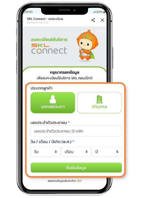 กรอกข้อมูลเพื่อลงทะเบียน และกดเลือก "ยินยอม" เพื่อยอมรับข้อกำหนดและเงื่อนไขของบริการ โดยลูกค้าประเภทบุคคลธรรมดา : กรอกหมายเลขบัตรประชาชน และวัน/เดือน/ปีเกิด และลูกค้าประเภทนิติบุคคล : กรอกเลขทะเบียนนิติบุคคล และวัน/เดือน/ปีที่จดทะเบียน