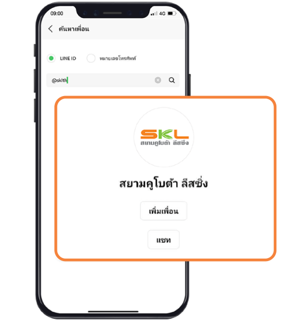 ค้นหาพิมพ์ @sklth หรือ สยามคูโบต้า ลีสซิ่ง และกด "เพิ่มเพื่อน"