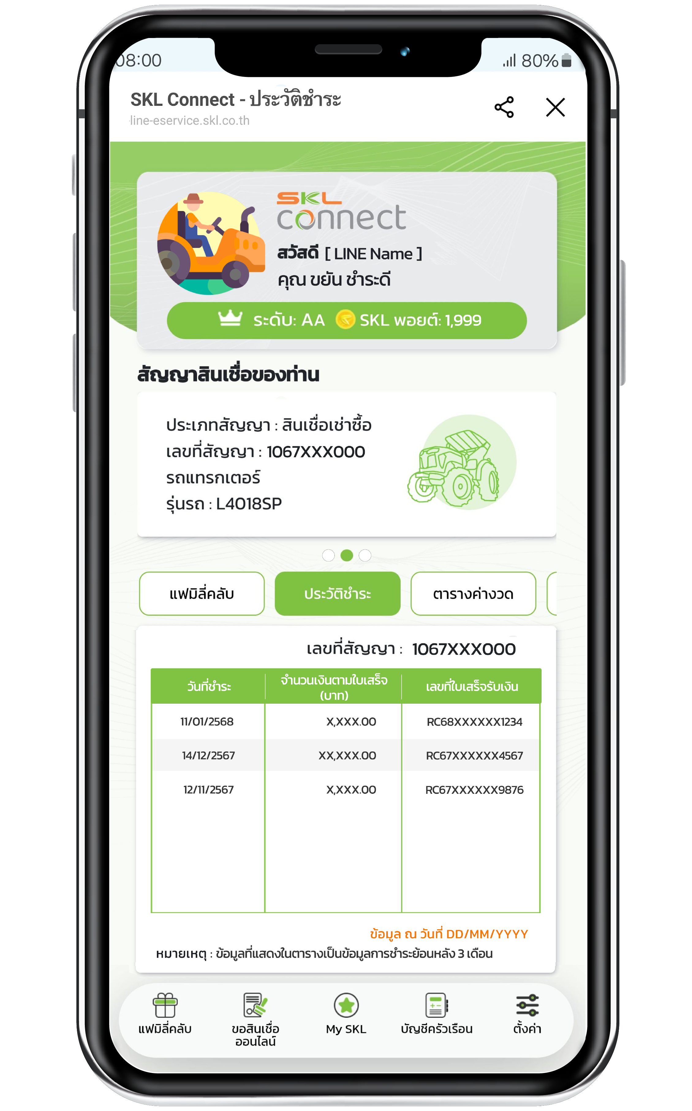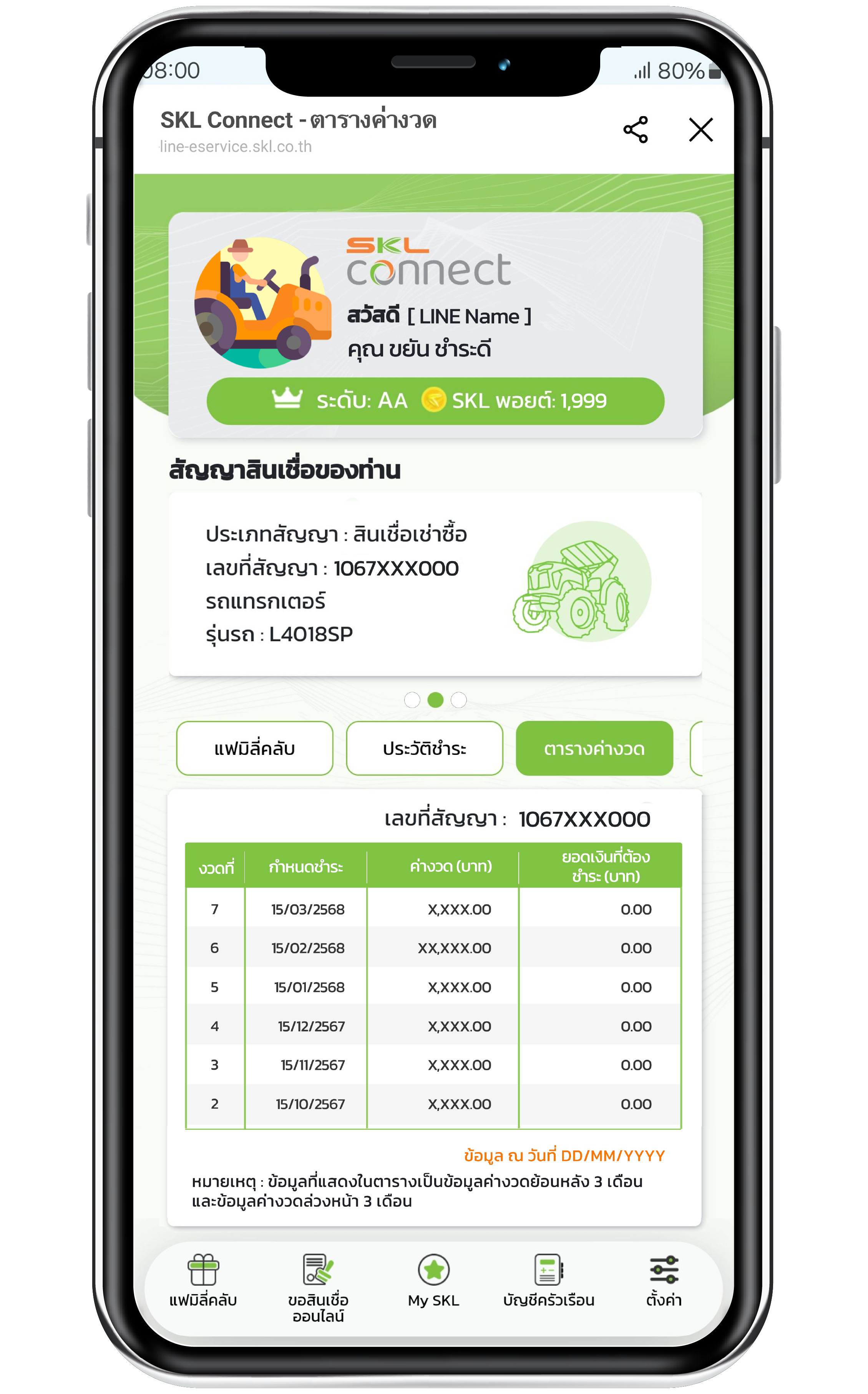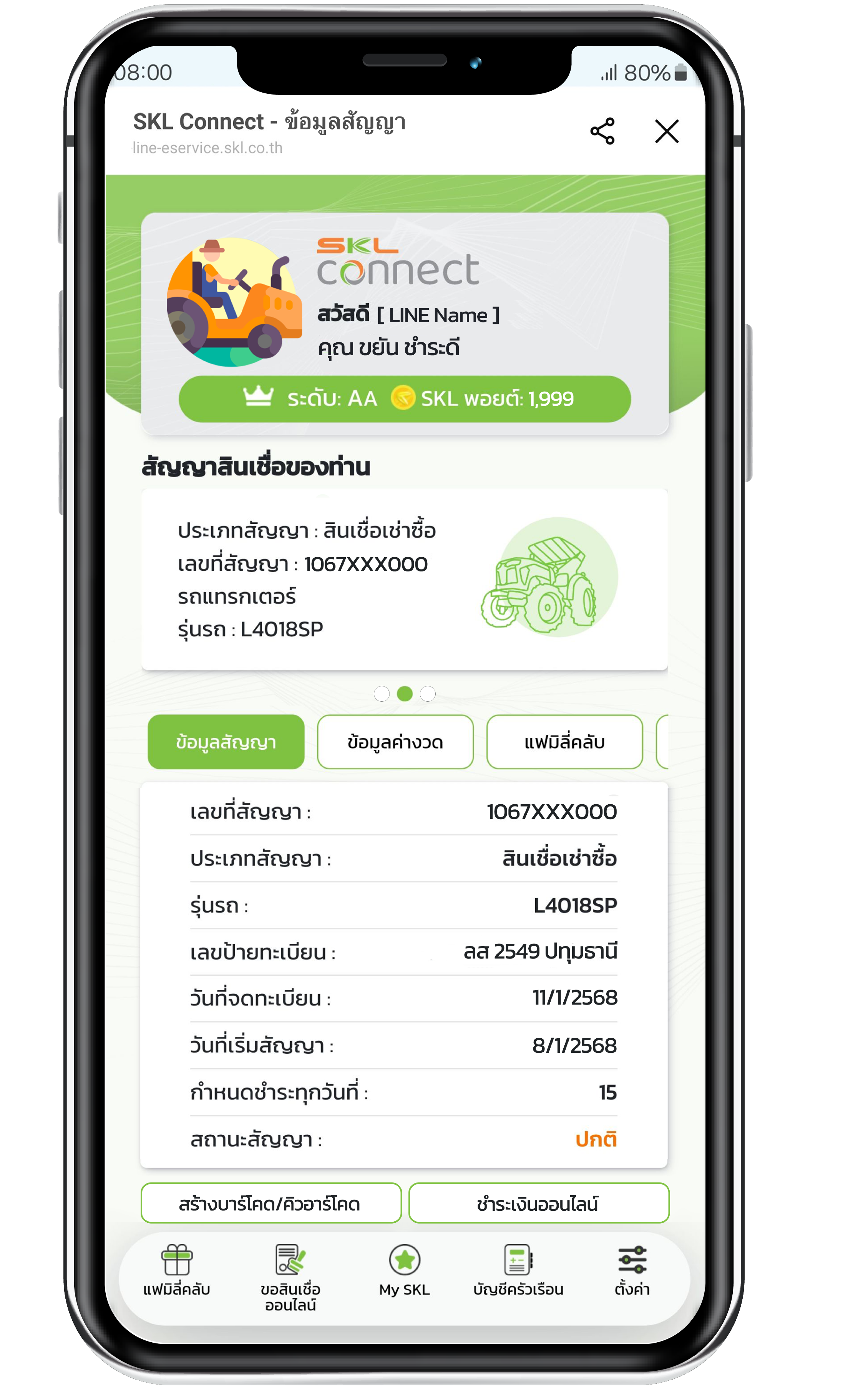 นอกจากข้อมูลรายละเอียดค่างวดในสัญญาสินเชื่อแล้ว ท่านสามารถตรวจสอบข้อมูลและใช้บริการฟีเจอร์อื่น ๆ บนบริการ SKL ได้อีก ดังนี้