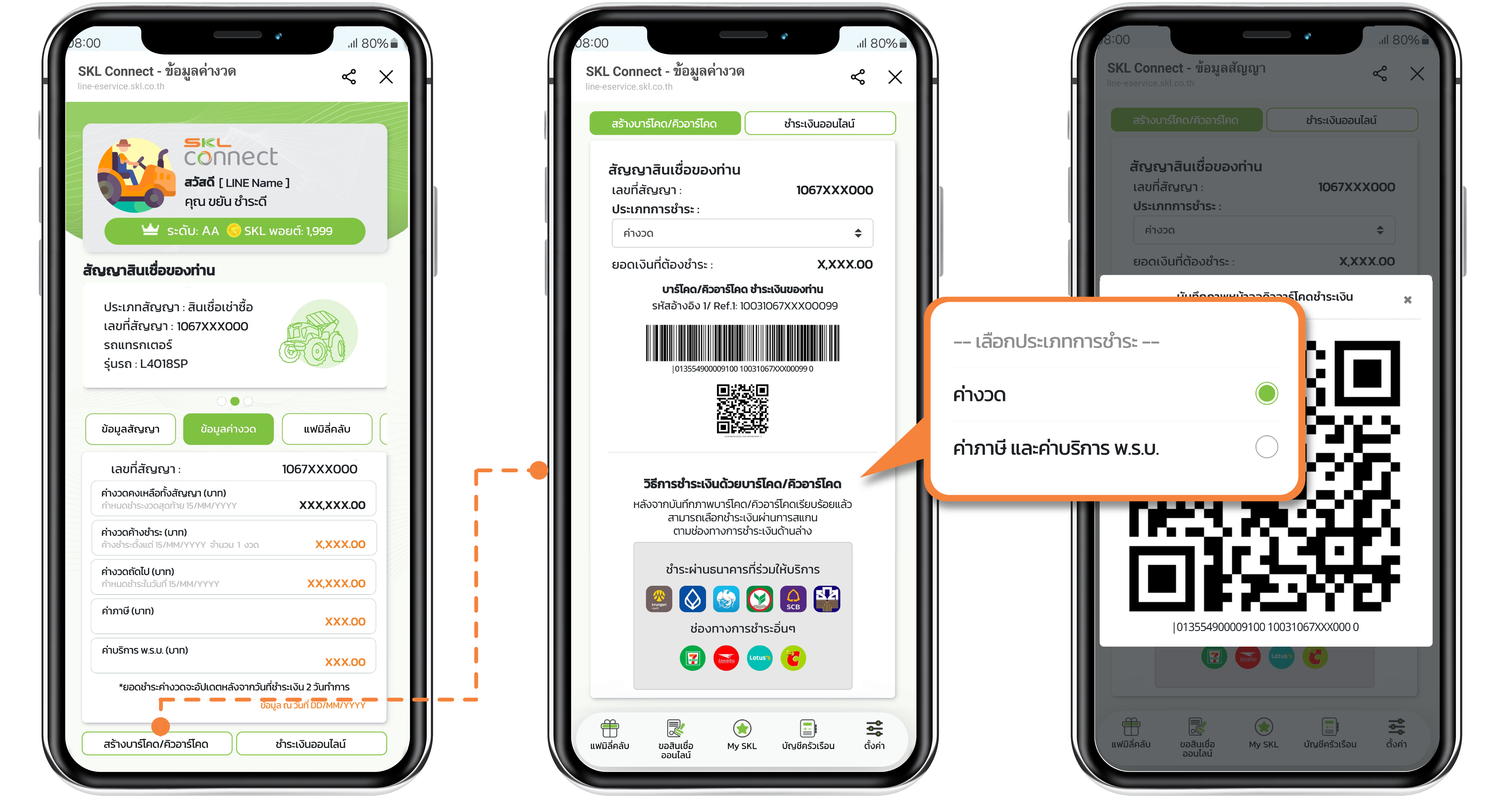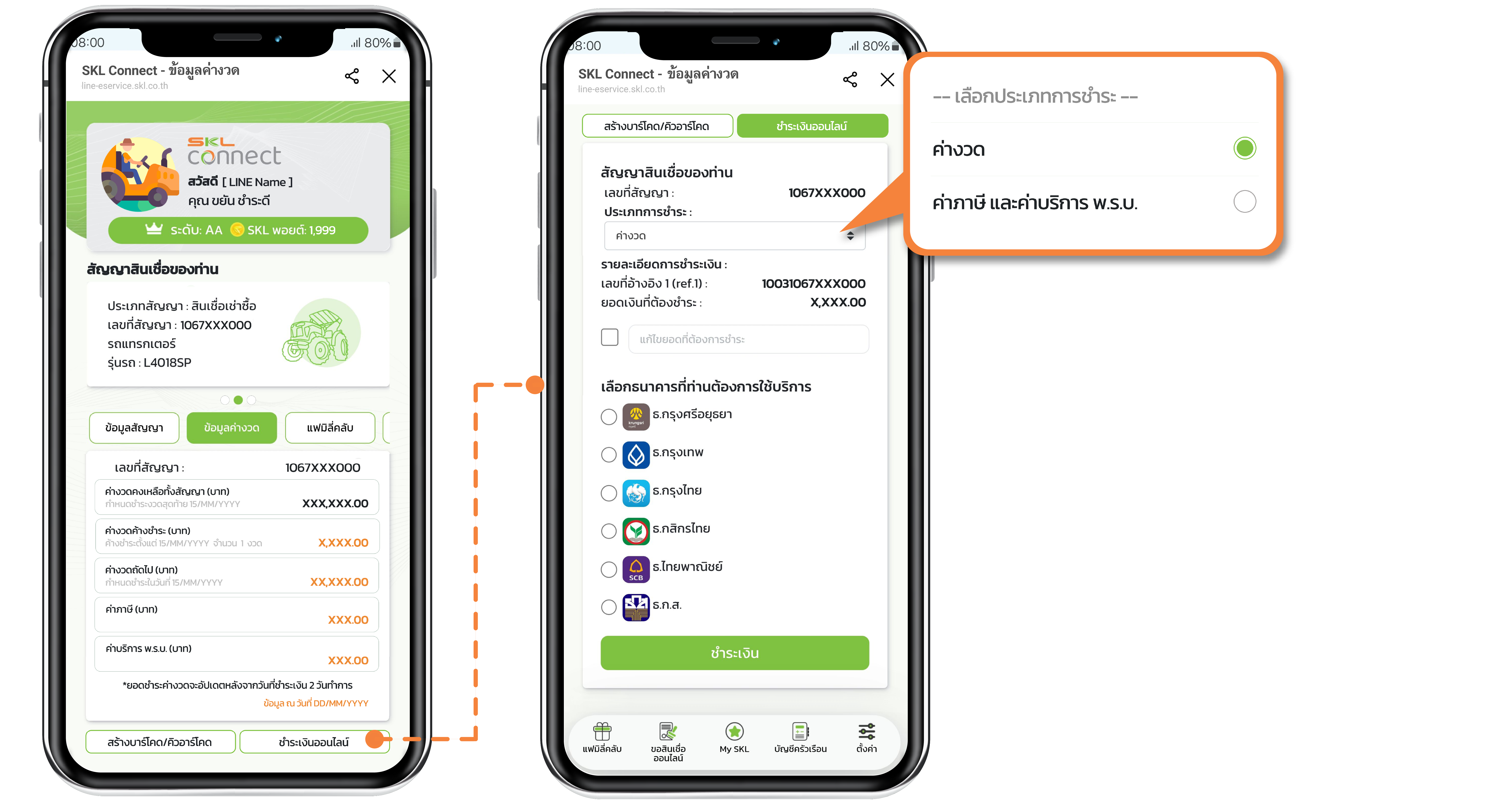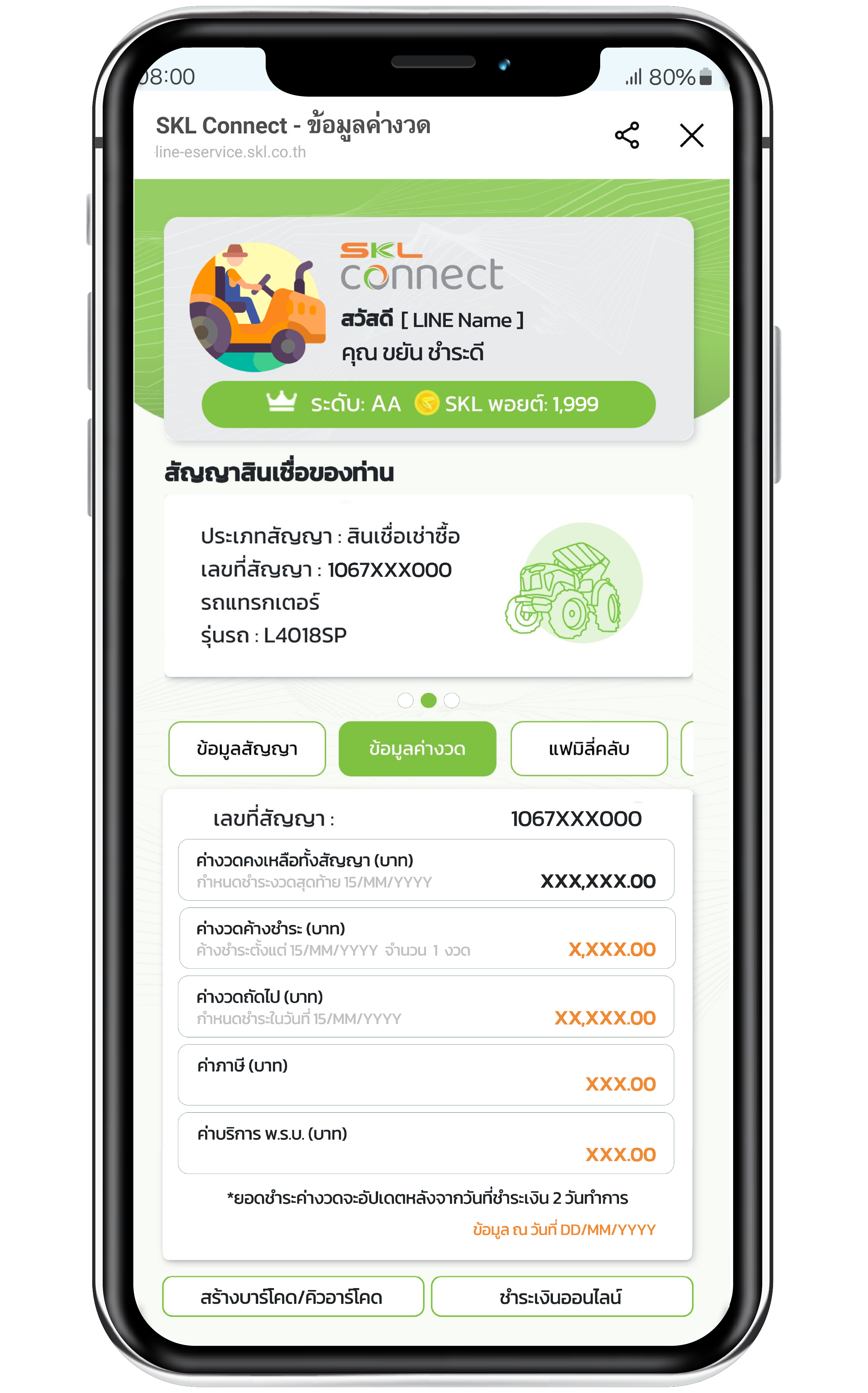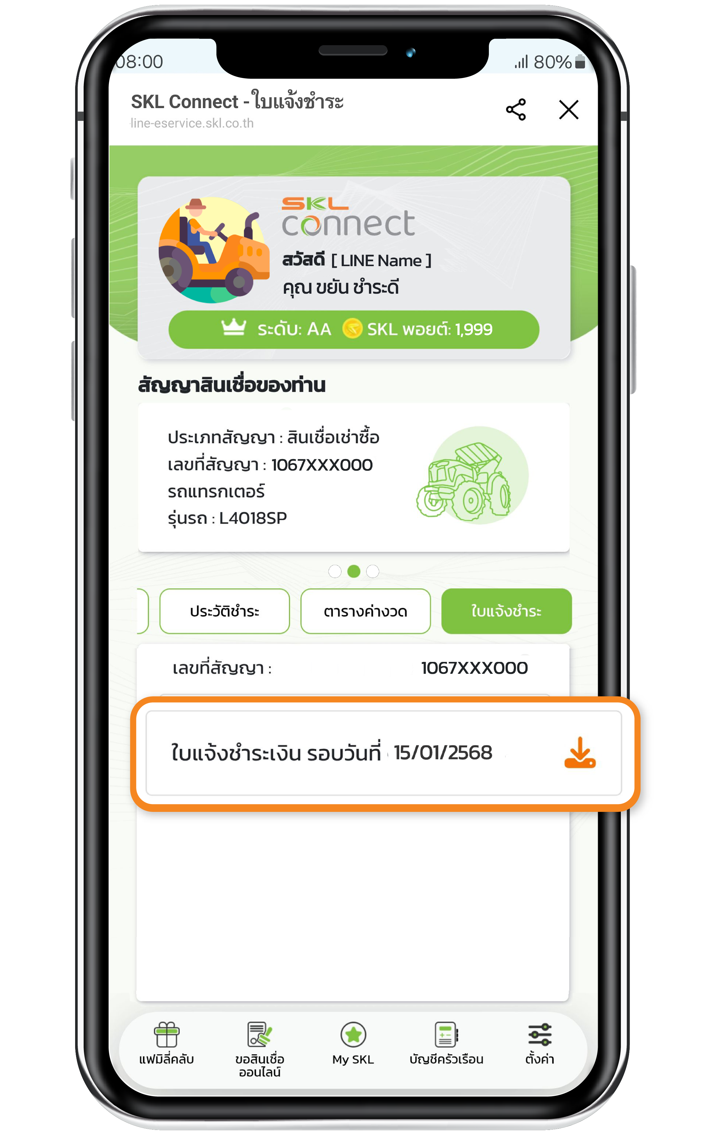 นอกจากข้อมูลรายละเอียดค่างวดในสัญญาสินเชื่อแล้ว ท่านสามารถตรวจสอบข้อมูลและใช้บริการฟีเจอร์อื่น ๆ บนบริการ SKL ได้อีก ดังนี้